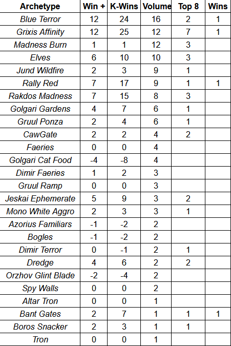 Thirteen decks had at least ten appearances in the Top 32 over the past month. Blue Terror and Madness Burn were the two most popular and also are leading the field in Top 8 appearances. Win+ measures a deck’s performance against an X-3 record in the Swiss rounds. K-Wins takes all wins less all loses, Top 8 performance included. These are mere counting stats and without proper context do little to tell us about how well these decks are performing in comparison to each other.