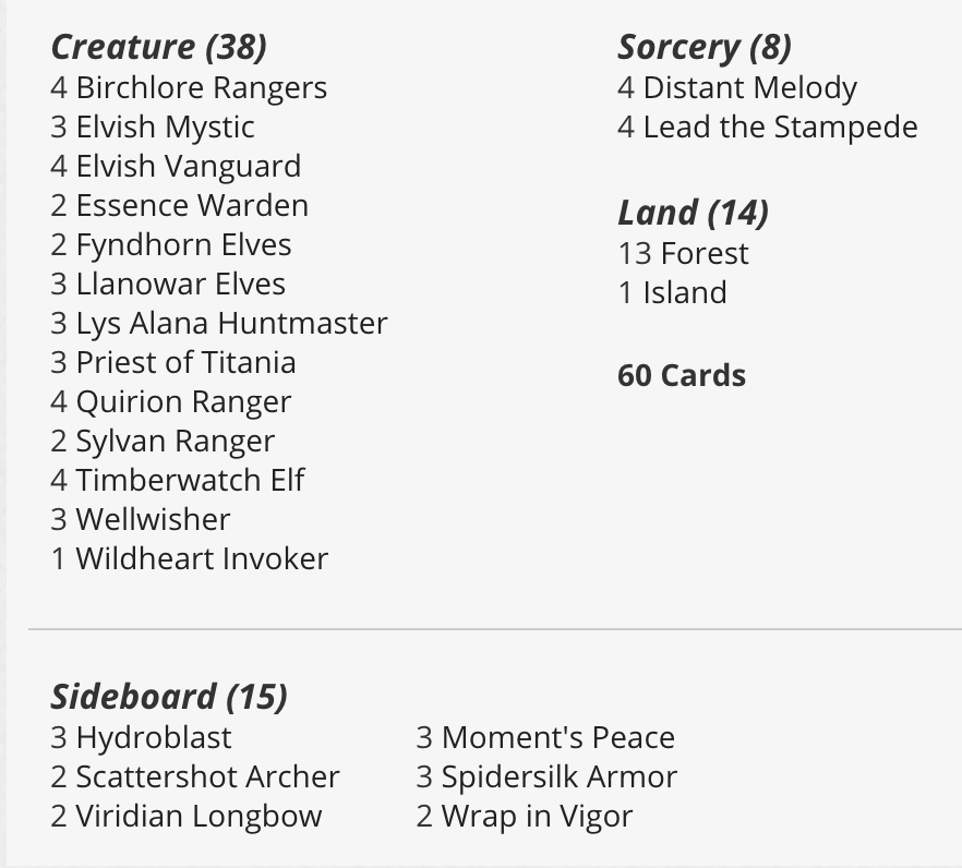 There are some notable omissions in this list – Nettle Sentinel for one – as well as relying on Viridian Longbow rather than Harsh Sustenance to get the job done against Moment’s Peace and Stonehorn Dignitary. Cookie also upped the land count to a whopping 14 and came prepared to defend their army with Hydroblast for sweepers, Spidersilk Armor for sweepers, and Wrap in Vigor for Sweepers. Cookie also opted to eschew Winding Way in favor of four Lead the Stampede and four Distant Melody, possibly in deference to their creature-less sideboard.