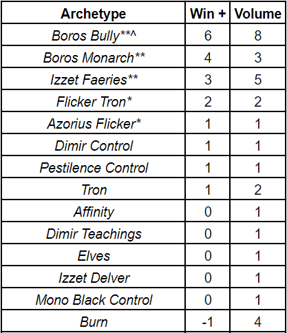 Boros Bully, Boros Monarch, and Izzet Faeries each took home two slots in the Top 8. The recent run of Bully decks have moved back to at least a pair of Palace Sentinels, giving them a sheen on Monarch. They remain two distinct archetypes, with Bully leveraging more aggressive creatures and Monarch favoring burn-based-reach, but there is definitely overlap. Meanwhile Izzet Faeries has surged in the standings thanks to Mystic Sanctuary. The ability to regrow any instant or sorcery, for free, is huge. Combine this with Deprive or Mystic Sanctuary and you have the backbone of a deck as long as the land remains legal.