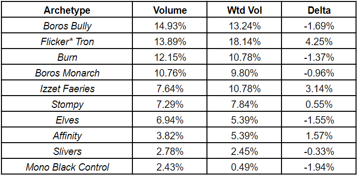 While Flicker Tron decks may have been largely absent the past two weeks they remain one of the best performing macro-archetypes over the Throne of Eldraine season. To date the second best performing deck is Izzet Faeries, but it still has less than 10% of Top 32 volume.