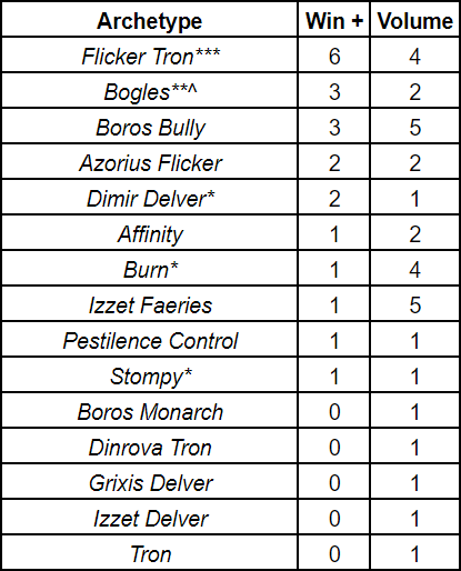 This chart only tells part of the story. Looking at archetypes that make have at least 6 Top 32 finishes, Boros Bully is the most popular. Flicker Tron decks are the second most popular archetype but they continue to perform at an average record of X-2 or better. If we isolated Flicker Tron – that is decks running both Stonehorn Dignitary and Dinrova Horror in the well established shell, the deck makes up 10% of the metagame while taking home 16% of the weighted metagame. Compare that to Izzet Faeries – the next best deck.