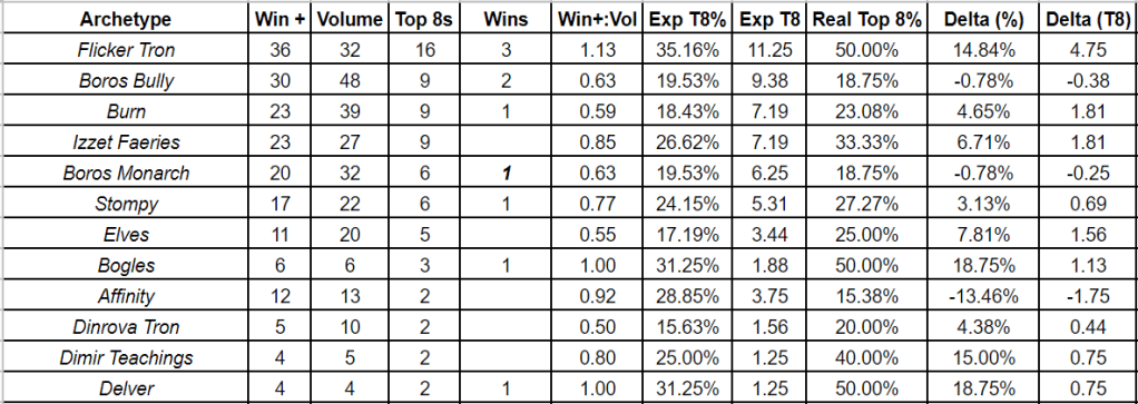 For example: Flicker Tron has made Top 8 in half of its Top 32 appearances and, using this metric it is out performing its expected Top 8 appearances by nearly 5 trips.