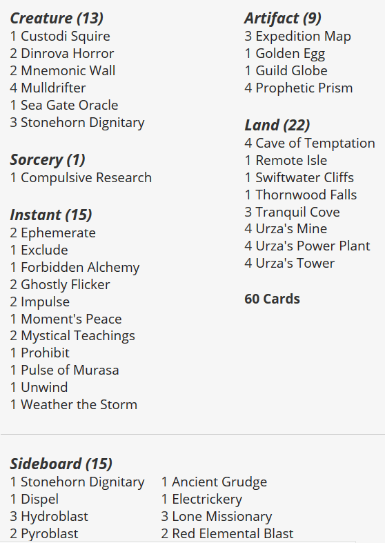 Let’s start at the top: Flicker Tron won the first challenge of the season. The winner – kasa – went with a creature heavy build that featured one copy of Custodi Squire. They also ran a copy of Unwind, a card popularized by the Italian Pauper community. Kasa also upped the cantrip artifact count with one copy each of Guild Globe and Golden Egg. Unlike the other two Tron decks in the Top 8, kasa opted not to run Rain of Revelation.