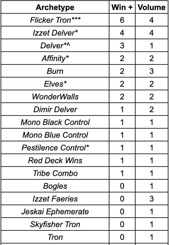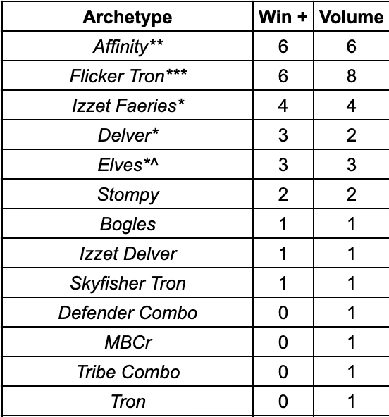 There is a distinct lack of aggressive decks in the metagame. And on top of all that, the Top 8 looks nearly identical, with a lone Pestilence Control deck making it over a second copy of Affinity. It is not that the metagame is solved as much as there is just not a ton of space to find success. Yes, decks like WonderWalls will crop up and make waves for a few weeks but the beat of that butterfly wing will not spark the tropical storm to unseat FlickerTron.