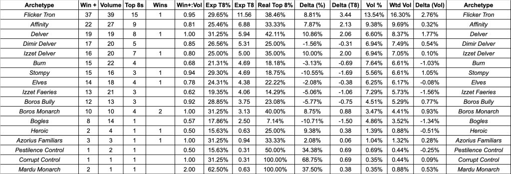 Flicker Tron is holding just over one-fifth of all Top 8 slots, but it’s underperforming compared to last season. The Delta of Weighted Volume to Actual was closer to 7% in Throne of Eldraine. Here – it’s less than half that. In fact, the skew for all decks has decreased. The flattened power level bodes well for the long term health of Pauper. At the same time, it puts decks that have a lot of decent matchups (but few great ones) in a position to succeed provided the pilot finds the correct build on the current week.