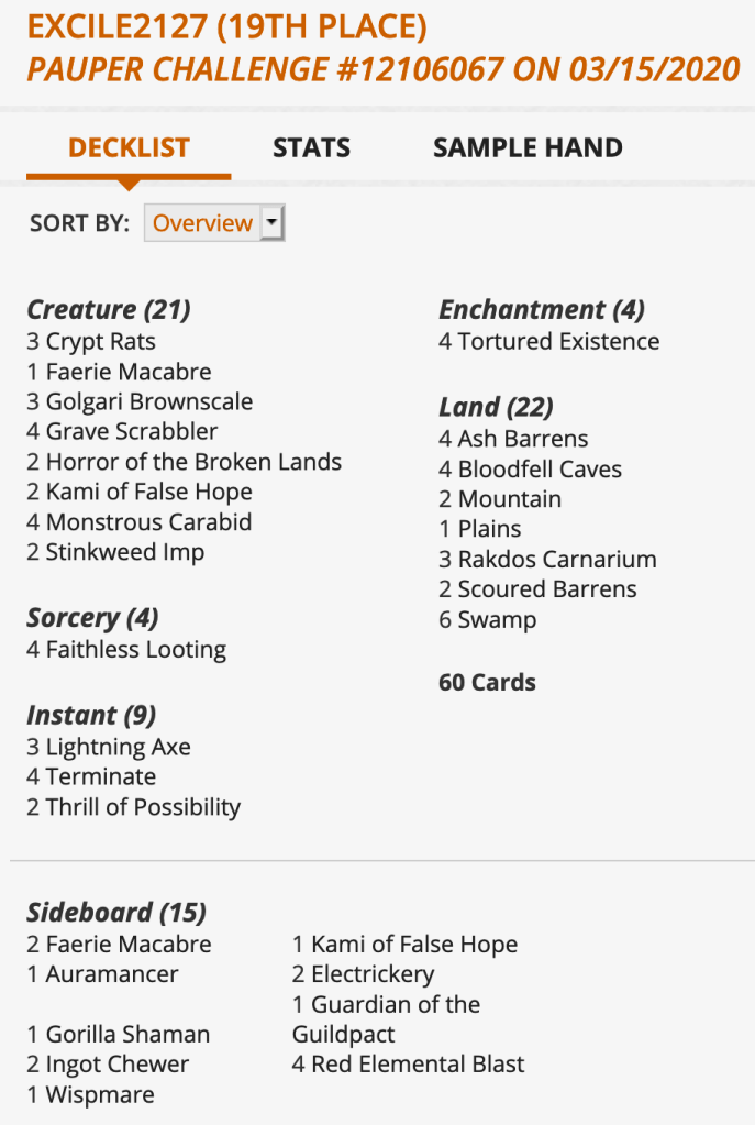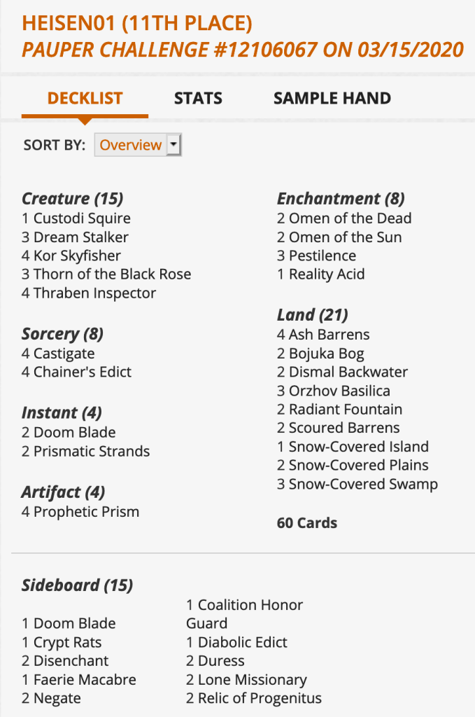 The March 15th Pauper Challenge continued to showcase the slow decline of Flicker Tron. The titan of the format has been in a controlled fall for the past few weeks and while it is still a major player in the format it isn’t the behemoth that it was during Throne of Eldraine season.