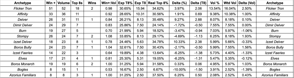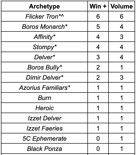 Let’s get into the numbers for a bit. I assign every deck that goes X-2 or better a score based on performance. An X-2 record is one point, X-1 is two, and X-0 is three. I then take the sum of this score (labeled as Win+ in my documents) and figure out each archetype’s weighted volume as it relates to actual volume. During Throne of Eldraine season, Flicker Tron lapped the field with a delta of 6.99%. Only two other decks with more than 10 appearances had a positive delta (1.21% and 0.11%). This season Flicker Tron’s delta currently sits at 2.5%. There are five decks with positive deltas and at least 10 appearances (inclusive of the April 1st Super Qualifier, which we’ll get to in a minute).
