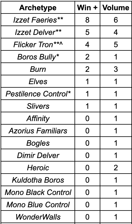 How good were Izzet decks on Saturday? Out of 23 possible Win+ points they took home 13 – almost 57%. These are the sort of numbers, if sustained, could be a cause for alarm. Yet I’m not worried at this time. Let’s look at Sunday.