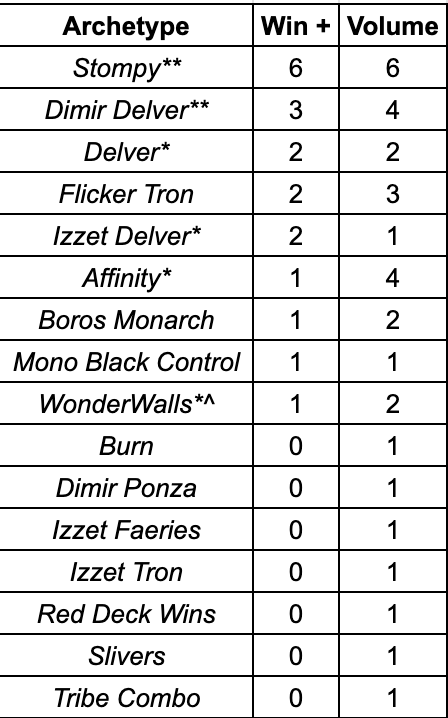 Again, we see Stompy put up good numbers. We also see Dimir Delver take two slots in toe Top 8. The ability to run Suffocating Fumes in the maindeck is rather enticing. It is never a dead card thanks to cycling but when it is good it is great. That being said I still believe the Izzet versions of these decks to be the better option.