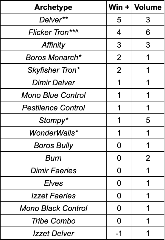 Affinity had a Top 8 appearance and had a Win+ of four in five appearances. While no one ran Dispersal Shield, no one ran Metallic Rebuke either. While I wasn’t wrong, I wasn’t exactly right either.