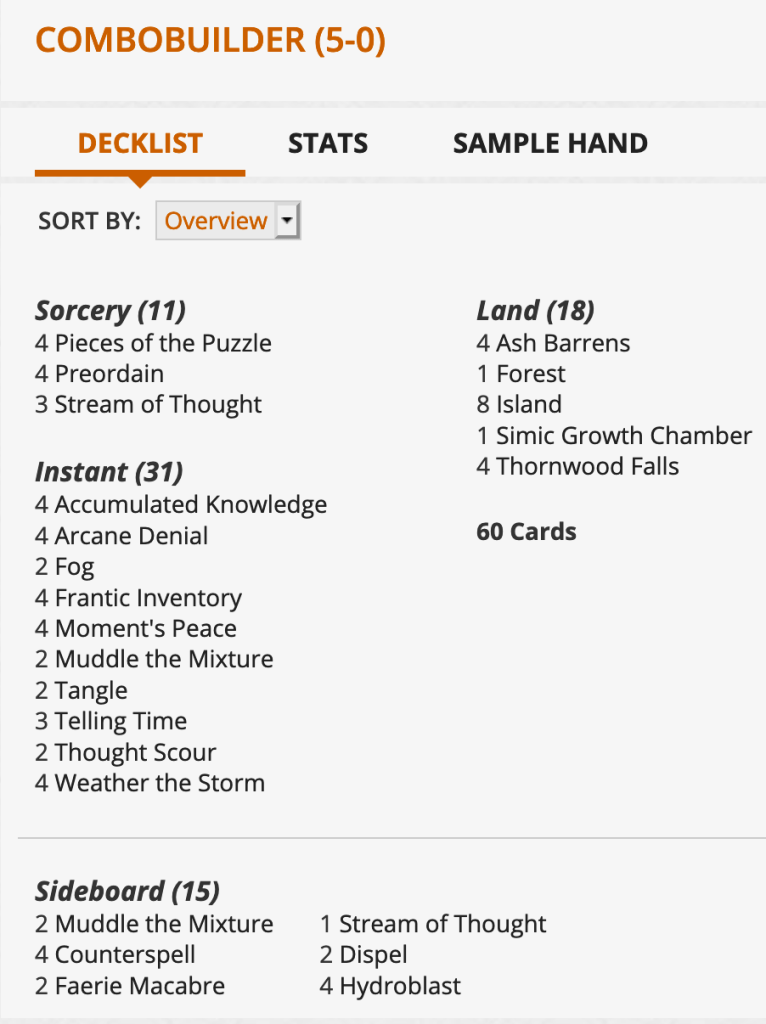 Most builds of Turbo Fog include Jace’s Erasure as a win condition to help speed along the natural process. Combobuilder even includes Muddle the Mixture – a common tutor for the enchantment – in their build. But instead of Erasure they are running three copies of Stream of Thought which seems awesome. Stream has the advantage of shuffling key cards back into your library and in the late-game it comes in with Replicate.