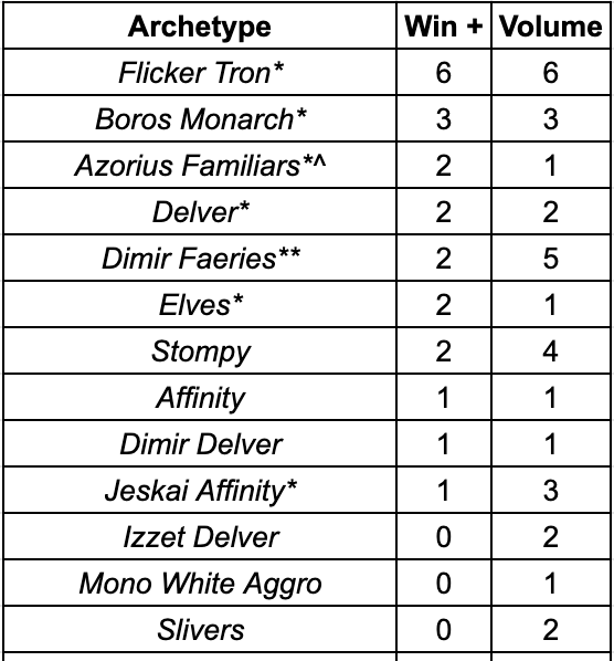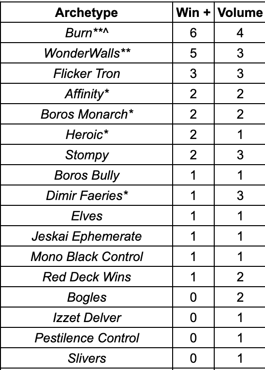 Here are the top performing archetypes with at least five appearances. I included WonderWalls and Azorius Familiars here due to their results over the past weekend.