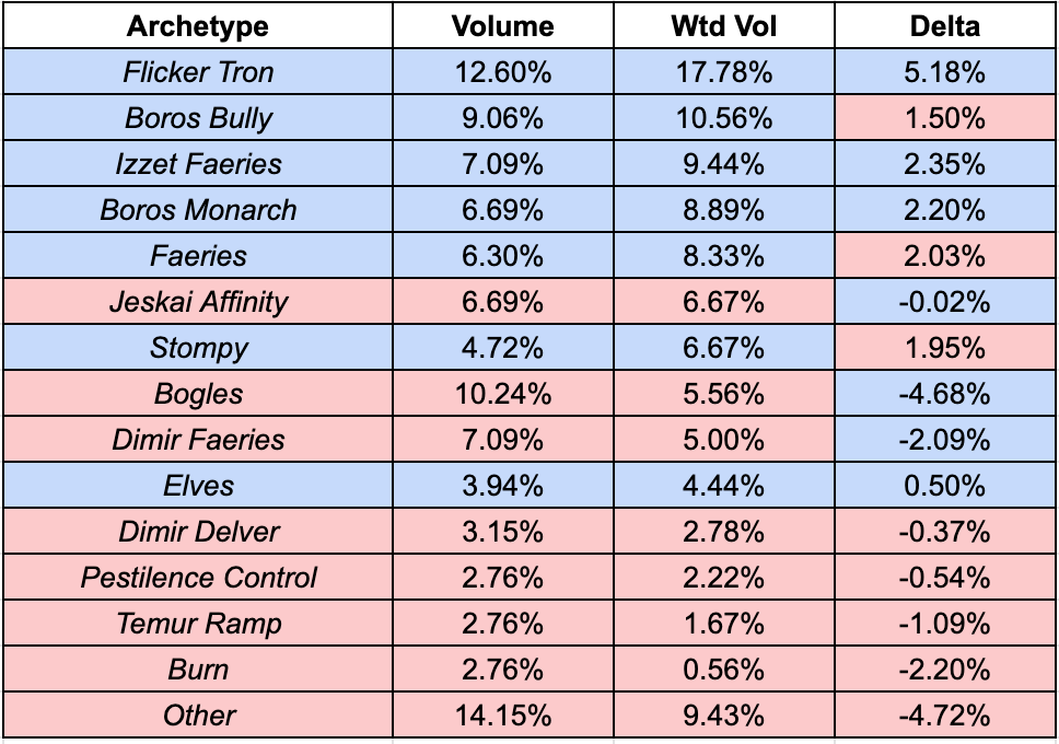The various Spellstutter Sprite/Fall from Favor decks are currently at the top, with Izzet Faeries winning both Challenges. Dimir Faeries is the most popular deck from the weekend but had a rough Sunday compared to Saturday. And yet lingering in third is Flicker Tron.