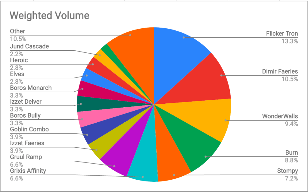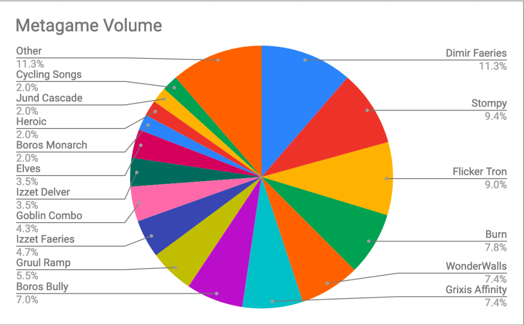 Speaking from the perspective of popularity, Dimir Faeries leads the way with Stompy and Flicker Tron in the second group, Burn, WonderWalls, Grixis Affinity, and WonderWalls as the next tier and a large scrum around the 5% mark. This is a relatively diverse metagame at a macro level – even if you lump all the Spellstutter Sprite decks together they don’t top 20% of the raw volume.