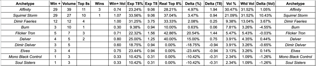 After four Challenges, this is every deck to make at least 3 appearances in the Top 32 – a 2% volume threshold. It is clear that the metagame is heavily skewed towards the top. This wouldn’t be as large an issue if not for the fact that the metagame today looks remarkably similar to all of Modern Horizons 2 season – the same two decks at the top while Dimir strives to be relevant.