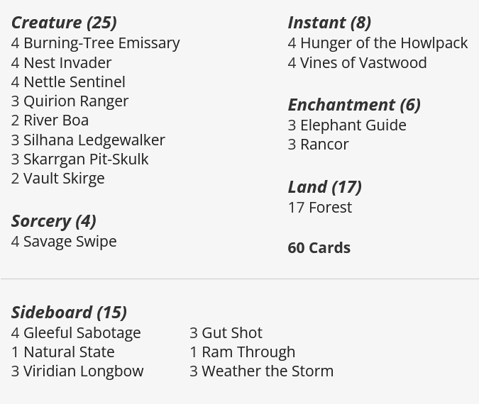Stompy has been popping up again after a decent vacation from the metagame. The deck is capable of presenting numerous threats in short order, and can run an offense that often side-steps Faeries (River Boa, for example). Stompy does have an uphill climb considering the popularity of both Pestilence as a strategy and Fiery Cannonade as a card, and that’s completely ignoring the fact that Affinity can often win before Stompy has a chance. All that being said, if Affinity was returned to a previous power level then perhaps Stompy could emerge as a more natural limit on Faeries power.