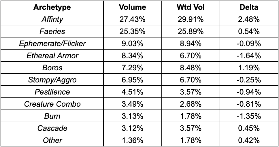- Volume represents the number of Top 32 appearances; Weighted Volume looks at the macro archetype’s prevalence in the number of wins above 3 losses.