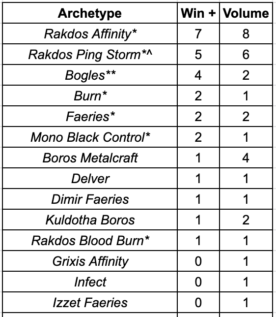 Rakdos Affinity is the most popular deck and one of the most successful. It is taking down Top 8s at an impressive rate and shows no real signs of slowing down. The deck, like several others, is making use of the powerful Experimental Synthesizer as a way to see more cards and power out fast starts. Affinity may lack the quick combo kill of Atog-Fling but it can still end games by turning lands into damage with Makeshift Munitions and Disciple of the Vault.