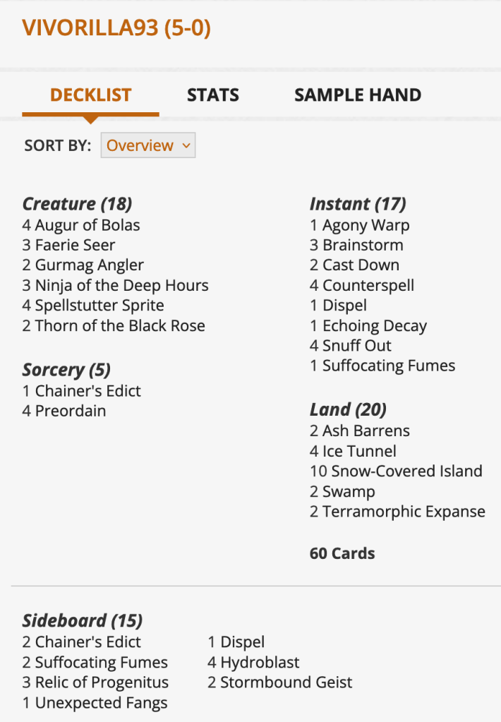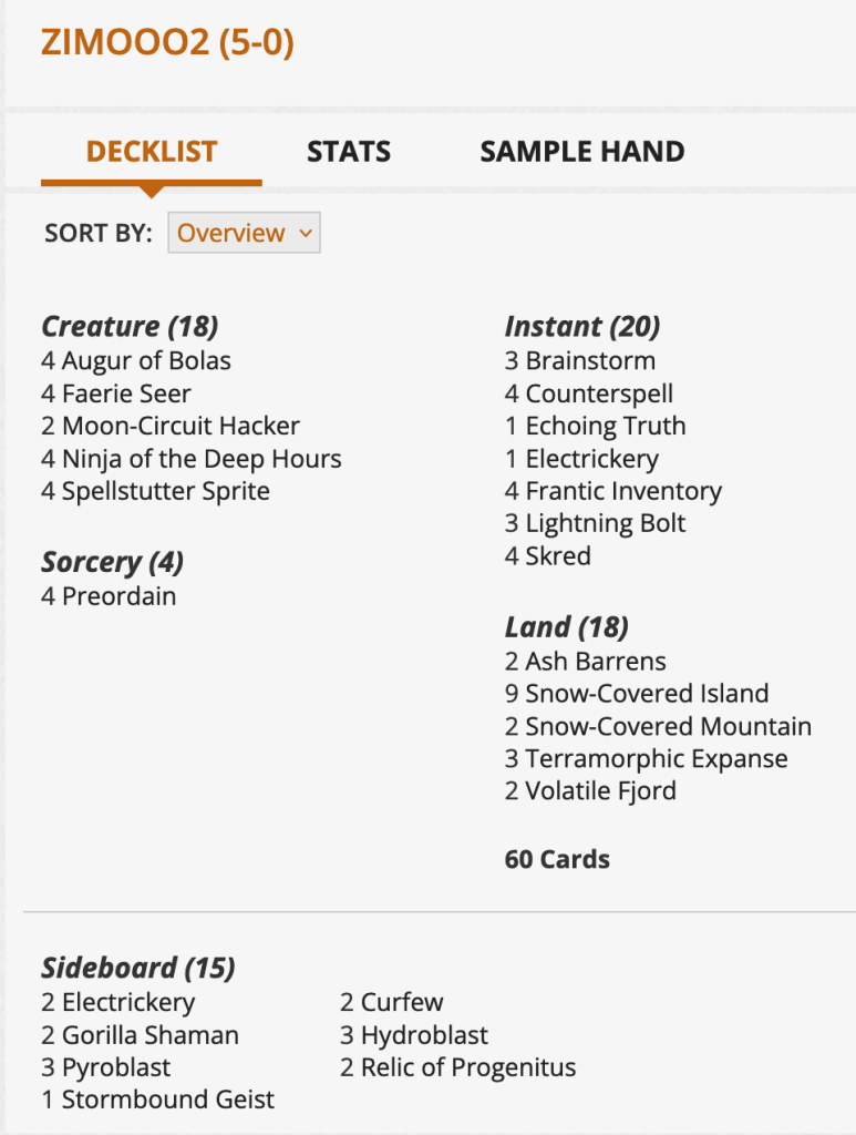 While Izzet Faeries is the only deck where running Snow-Covered Island provides an in-game advantage, any blue deck can garner an out-of-game advantage by also running Snow-Covered Island in an effort to fool the opponent into planning for Izzet Faeries. Therefore Snow-Covered Island does not mean the opponent is running Izzet Faeries but rather almost any base blue deck. I would feel comfortable ruling out some of the Cleansing Wildfire piles since they really want to have an indestructible land on turn one to play their namesake spell on turn two, but that leaves the following decks as possible options: