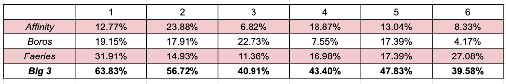 Taking a look at the above chart we can see a trend of Faeries performing somewhere between “good” and “excellent”, while the other major plays vacillate between “above average” and “great”. For all the press Affinity gets for its busted cards and Boros gets for Experimental Synthesizer, Faeries continues to be the most consistently good performer in the bunch.