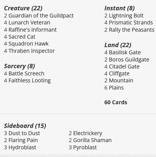 Boros Bully was already a deck based on a damage engine – that of going wide and ending the gate with Rally the Peasants. Basilisk Gate gives the deck another engine that works in a different direction. Where Bully traditionally won by going wide, Basilisk Gate allows it to go tall and present a single threat that can end the game. Guardian of the Guildpact is a fine target but Sacred Cat might be better right now. With Monastery Swiftspear and Affinity pressuring life totals, a 1/1 lifelink that can absorb a blow and come out swinging for Armadillo Cloak levels of life gain is huge. The fact that it requires two answers from Faeries does not hurt either.