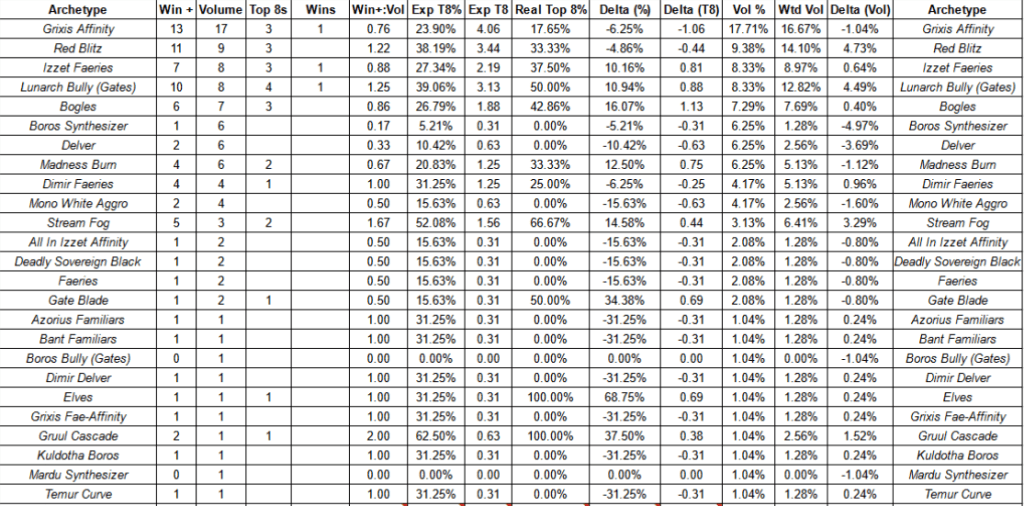 While this image may be a bit hard to read, things should be somewhat clear. The same macro strategies continue to perform well with Affinity, Faeries, and Boros all taking down events. The big story, to me at least, is the ascendancy of the Lunarch Veteran version of Boros Bully that runs the Basilisk Gate damage engine.