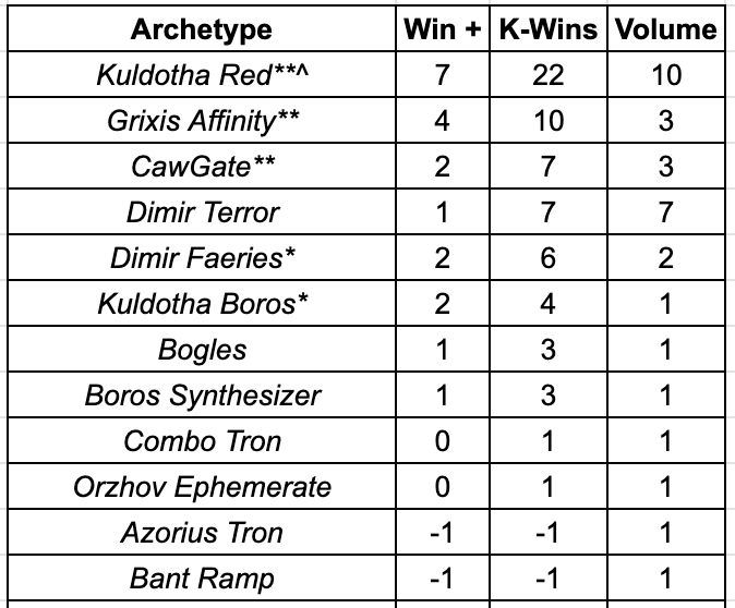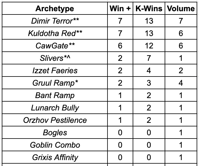 K-Wins: Measures all wins less all losses, Top 8 inclusive. Measures a deck’s strength in a winner’s metagame