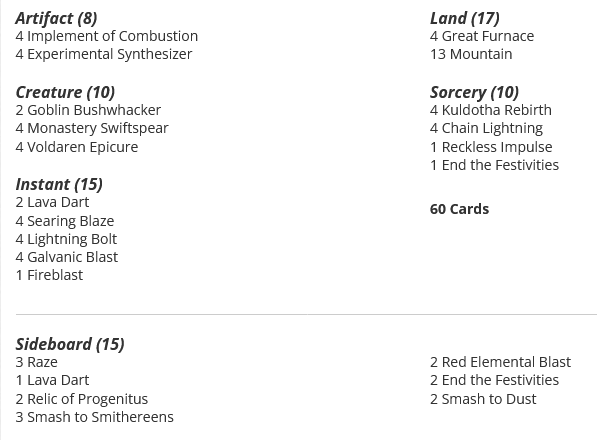 Grixis Affinity and Kuldotha Red continue to define the Pauper metagame. Kuldotha Red was the most popular deck in the Top 32 metagame with 120 appearances alongside 20 Top 8 finishes and an impressive 6 wins (including the Super Qualifier). The deck also had an average Win+ of 0.58 and a K-Win average of 1.6. Grixis Affinity had 94 finishes in the Top 32, taking down a whopping 28 Top 8 slots and winning three events. Affinity’s Win+ average clocked in at 0.83 and it’s K-Win average settled at 1.84. When looking at True Volume, Kuldotha Red finished with 16.11% (down 1.64% from its actual volume) while Affinity closed the season with a True Volume of 14.92% (up 1.01% from it’s actual volume).