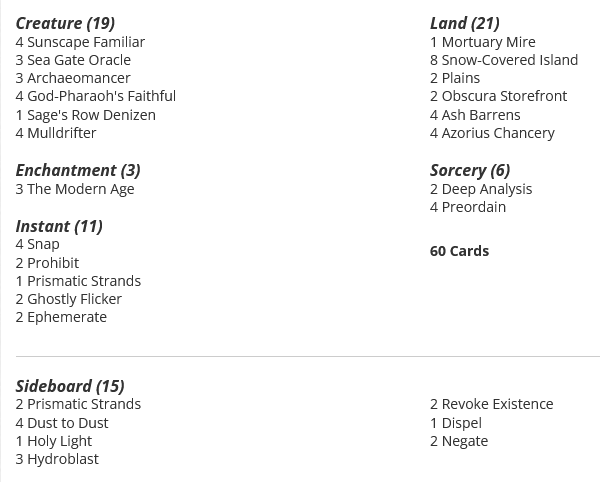 I don’t want to write this without acknowledging two of the better decks from the season: Azorius Familiars and Flicker Tron. Both of these strategies lean on a mana advantage (either from the Tron Lands or from Sunscape Familiar) to super charge the Ghostly Flicker/Ephemerate loop with Archaeomancer/Mnemonic Wall. From here these decks get to cherry pick the best option from their graveyard and eventually win the game thanks to their overwhelming advantage and ability to lock the opponent out of meaningful action.