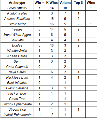 Where does that leave things going into next weekend? Red is going to be everywhere, but which version remains to be seen. It would not surprise me to see a small uptick in Familiars while Affinity remains constant. Bogles also had a strong weekend but I don’t see it having consistent staying power. If I were trying to tech for the meta I would want to try and figure out an Arbor Elf/Utopia Sprawl deck that could survive against red until it could stick a Flourishing Hunter.