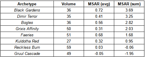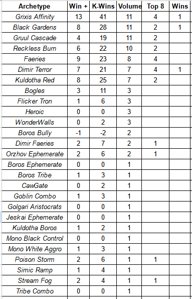 So what is it telling us today? Black Gardens has had an absurd season, as has Dimir Terror. Boggles numbers may be buoyed by a few particularly strong weekends and red, overall, is above average but potentially behind other major players. Gruul Cascade has some incredibly good weekends and some where it can barely put one foot in front of the other, indicating that build is more at the whim of variance.