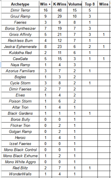 I use a few different metrics when looking at the Top 32 metagame. The first is just Raw Volume. The second is Win+, which takes the sum of all wins at X-2 or better in the Swiss and assigns a score; Win+ is helpful in measuring a deck’s Swiss round performance. K-Wins takes all of a deck’s wins and subtracts its losses, Top 8 inclusive; this helps to give a measure of overall performance. The final pair is call Meta Score and Meta Score Above Replacement, which takes the average of Win+ and K-Win to try and position an archetype against its field. This number helps to provide the most robust image of a deck’s performance.