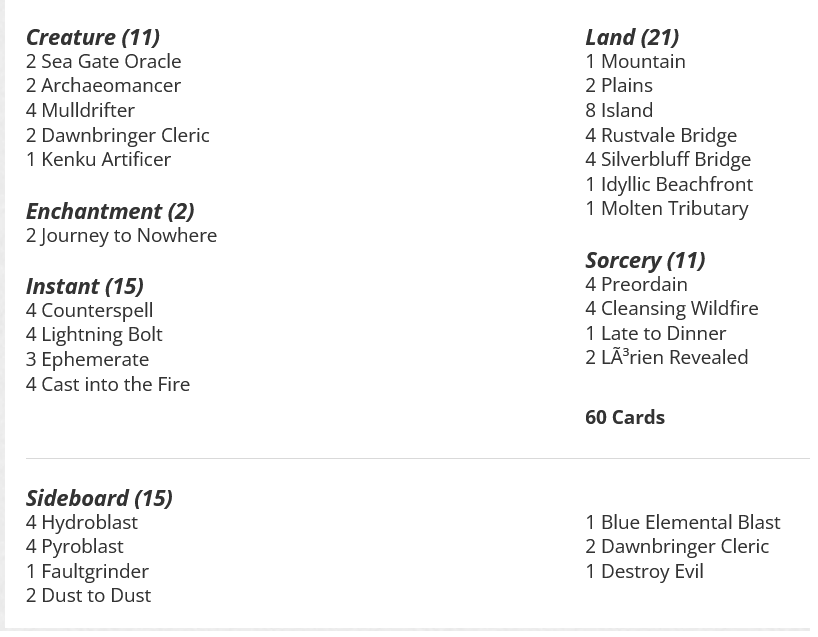 Pauper Format Panel member Mirco Ciavatta (probably better known as Heisen01) won the July 2 Challenge with this build of Jeskai Ephemerate. Jeskai Ephemerate is a solid midrange option that can adjust to most metagames and this week Mirco came prepared. With Dimir Terror and Grixis Affinity at the forefront last week, Skred was less ideal as a point removal spell. Leaning into Lórien Revealed with Idyllic Beachfront and Molten Tributary, this build has given up on the Skred package. Rather, there are maindeck copies of Cast into the Fire as a flexible answer to small threats and artifacts and Journy to Nowhere as a catch all, even if it does require additional mana to remove Tolarian Terror. Kenku Artificer can also create a never ending speed bump to hold the fort until the Ephemerate engine can take over.
