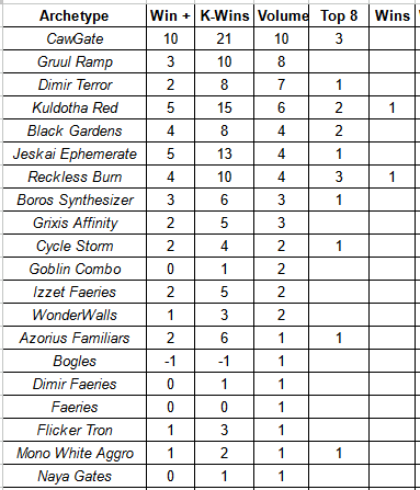 I use a few different metrics when looking at the Top 32 metagame. The first is just Raw Volume. The second is Win+, which takes the sum of all wins at X-2 or better in the Swiss and assigns a score; Win+ is helpful in measuring a deck’s Swiss round performance. K-Wins takes all of a deck’s wins and subtracts its losses, Top 8 inclusive; this helps to give a measure of overall performance. The final pair is call Meta Score and Meta Score Above Replacement, which takes the average of Win+ and K-Win to try and position an archetype against its field. This number helps to provide the most robust image of a deck’s performance.