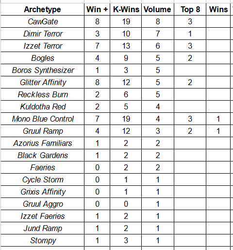 I use a few different metrics when looking at the Top 32 metagame. The first is just Raw Volume. The second is Win+, which takes the sum of all wins at X-2 or better in the Swiss and assigns a score; Win+ is helpful in measuring a deck’s Swiss round performance. K-Wins takes all of a deck’s wins and subtracts its losses, Top 8 inclusive; this helps to give a measure of overall performance. The final pair is call Meta Score and Meta Score Above Replacement, which takes the average of Win+ and K-Win to try and position an archetype against its field. This number helps to provide the most robust image of a deck’s performance.