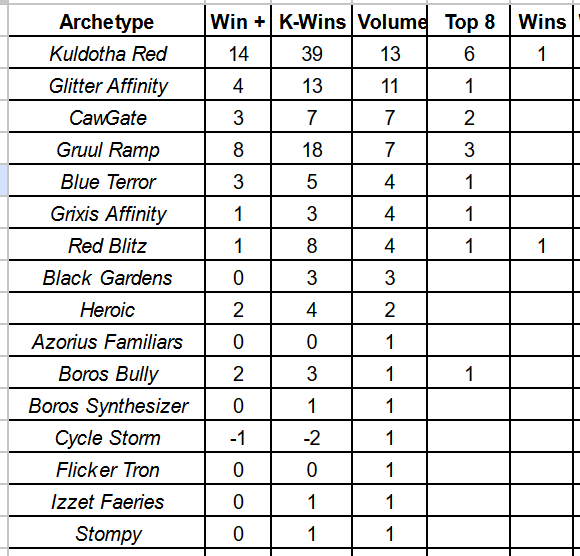For this we need to look at the Adjusted Meta Score Above Replacement. This score takes an archetype’s total Swiss record and it’s total Win-Loss record and compares it to those same averages for each other archetype, and then adjusts for metagame presence. Last weekend Kuldotha Red had an aMSAR of 1.79 – far and away the best performance on the weekend with Gruul Ramp holding the next highest score of 0.65.