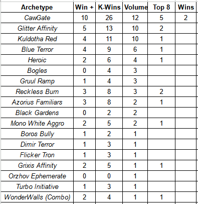 The statistic I have been tracking for the longest (beyond raw volume) is something called Win+. Win+ measures a deck’s Swiss record with a point for each win at X-2 or better. In a six round tournament a 4-2 record is worth 1 Win+ point; in a seven round tournament a 5-2 record is worth 1 Win+ point. The goal of this score is to see how a deck performs in relation to the lowest placing Top 32 deck (with a positive record). This metric only covers Swiss record; K-Wins however is inclusive of Top 8 wins and losses. K-Wins measures a deck’s total wins and subtracts the total losses. Together Win+ and K-Wins gives a broad picture of how well an archetype performs in the abstract.