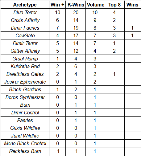 I use a few different metrics when looking at the Top 32 metagame. The first is just Raw Volume. The second is Win+, which takes the sum of all wins at X-2 or better in the Swiss and assigns a score; Win+ is helpful in measuring a deck’s Swiss round performance. K-Wins takes all of a deck’s wins and subtracts its losses, Top 8 inclusive; this helps to give a measure of overall performance. The final pair is call Meta Score and Meta Score Above Replacement, which takes the average of Win+ and K-Win to try and position an archetype against its field. This number helps to provide the most robust image of a deck’s performance.