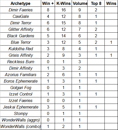 The difference, to me, is that the decks at the top feel like they should be there because for many years in Pauper those are the decks that have been there. Part of the discomfort with red’s success was in part due to the fact that it was doing things with which the color previously struggled. When Affinity was at the top of the metagame it felt unbeatable due to the resilience of its core shell. Dimir Faeries is not as impervious as Affinity or aberrant as red and so its recent climb has felt familiar.