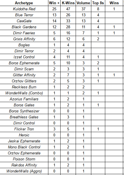 K-Wins takes an archetypes total wins and subtracts total losses, including the Top 8. Adjusting for volume Kuldotha Red clocks in at a respectable 1.27 – a solid Top 16 finish that isn’t quite 9th on breakers. It is the third best mark in this regard behind CawGate (1.78) and Black Gardens (1.52). While the data set is small this indicates that once these archetypes reach the final rounds of a tournament, the more flexible decks have done better to this point in this season.