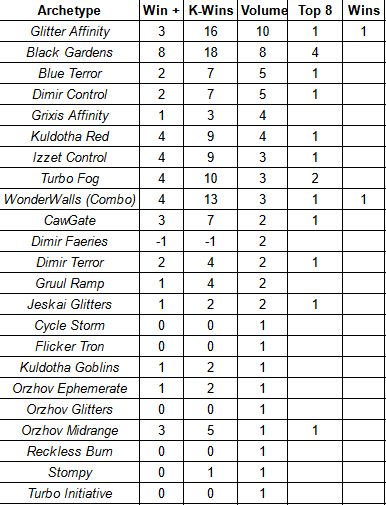 I use a few different metrics when looking at the Top 32 metagame. The first is just Raw Volume. The second is Win+, which takes the sum of all wins at X-2 or better in the Swiss and assigns a score; Win+ is helpful in measuring a deck’s Swiss round performance. K-Wins takes all of a deck’s wins and subtracts its losses, Top 8 inclusive; this helps to give a measure of overall performance. The final pair is call Meta Score and Meta Score Above Replacement, which takes the average of Win+ and K-Win to try and position an archetype against its field. This number helps to provide the most robust image of a deck’s performance.