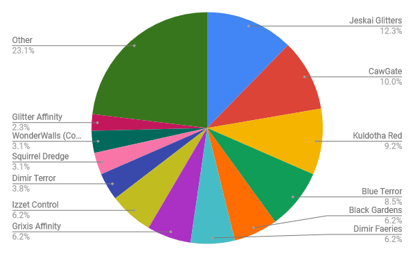 Despite the raw strength Jeskai Glitters, like many aggressive decks, have some serious shortcomings in Pauper. Looking at the raw volume chart above CawGate, Black Gardens, Dimir Faeries, Grixis Affinity, and Izzet Control can all be classified as control strategies in the metagame while Kuldotha Red and the Glitters variants occupy the assertive roles. The Terror variants are more mutable but tend to play towards a tempo game. All of this is to say that as strong as decks that play to the board can be there is power in keeping those threats off the board, either through removal, counters, or bounce. When 47.1% of the discrete metagame can take on the control role at a given time then the potential for answers to line up well with threats can make it difficult to get over the line for 20 damage.