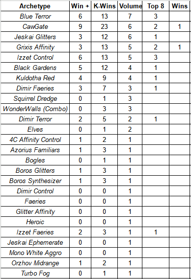I use a few different metrics when looking at the Top 32 metagame. The first is just Raw Volume. The second is Win+, which takes the sum of all wins at X-2 or better in the Swiss and assigns a score; Win+ is helpful in measuring a deck’s Swiss round performance. K-Wins takes all of a deck’s wins and subtracts its losses, Top 8 inclusive; this helps to give a measure of overall performance. The final pair is call Meta Score and Meta Score Above Replacement, which takes the average of Win+ and K-Win to try and position an archetype against its field. This number helps to provide the most robust image of a deck’s performance.