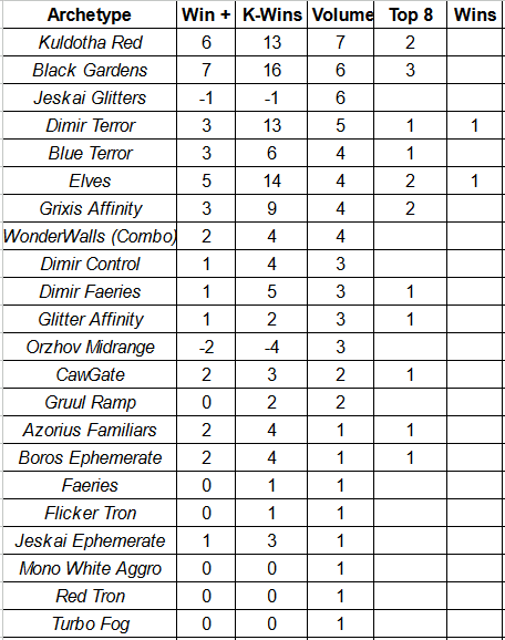I use a few different metrics when looking at the Top 32 metagame. The first is just Raw Volume. The second is Win+, which takes the sum of all wins at X-2 or better in the Swiss and assigns a score; Win+ is helpful in measuring a deck’s Swiss round performance. K-Wins takes all of a deck’s wins and subtracts its losses, Top 8 inclusive; this helps to give a measure of overall performance. The final pair is call Meta Score and Meta Score Above Replacement, which takes the average of Win+ and K-Win to try and position an archetype against its field. This number helps to provide the most robust image of a deck’s performance.