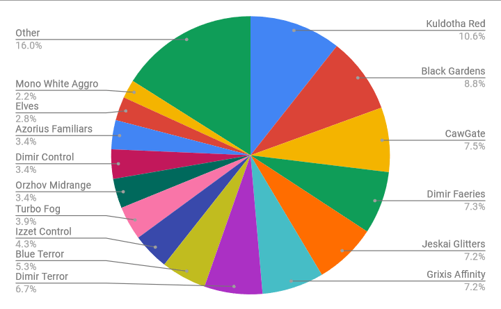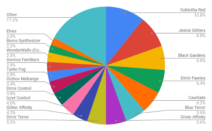 This chart represents the breakdown of each deck in the Top 32 is it relates to Winner’s Meta Share. Each deck is assigned a score based upon their collective overall performance and collective Swiss performance and this chart displays their share of this value. Kuldotha Red remains the most popular deck in the winner’s meta share but Black Gardens and CawGate overtake Jeskai Glitters. These decks can still “just lose” to the best red draws (as do most decks) but it also appears that there’s enough hate for artifacts that can help keep Affinity down. Make no mistake that Affinity is still a major player in the format but the weight of interaction may be having an impact.