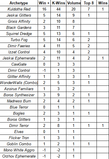 I use a few different metrics when looking at the Top 32 metagame. The first is just Raw Volume. The second is Win+, which takes the sum of all wins at X-2 or better in the Swiss and assigns a score; Win+ is helpful in measuring a deck’s Swiss round performance. K-Wins takes all of a deck’s wins and subtracts its losses, Top 8 inclusive; this helps to give a measure of overall performance. The final pair is call Meta Score and Meta Score Above Replacement, which takes the average of Win+ and K-Win to try and position an archetype against its field. This number helps to provide the most robust image of a deck’s performance.