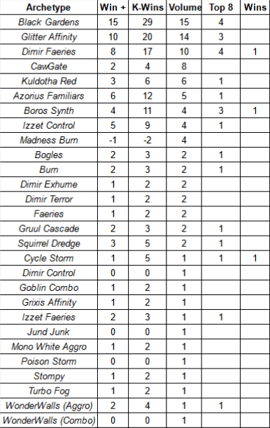 The last thing I want to note for this week is the small bounce in Kuldotha Red. The deck had a fairly miserable performance last weekend with an aMSAR of -0.29 – meaning it was worse than an average choice in the Top 32 – with 0.52% of the winner’s meta share. Most recently it did not return to its heyday but took up a very respectable 4.79% of the winner’s meta, improving its aMSAR to -0.07, only ever so slightly worse than an average Top 32 deck. I do not expect Kuldotha to jump back to the top of the meta next week but it could see another step up as people attempt to adjust to beat the current top three of Black Gardens, Dimir Faeries, and Glitter Affinity.