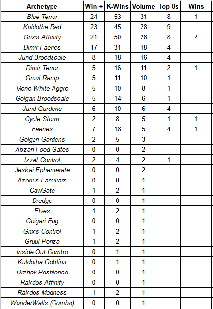 But let’s dive deeper. Over the August 30-September 1 weekend Faeries did not have any Top 32 appearances. In other words all of its results came from the September 6-8 weekend where it had an aMSAR of 1.05 (the best score on the weekend) with a 9.03% share of the Winner’s Metagame over 5.21% of the Top 32 metagame. Put another way, in the span of one weekend Faeries not only put itself back on the map, but is climbing back to the upper tier of the metagame.