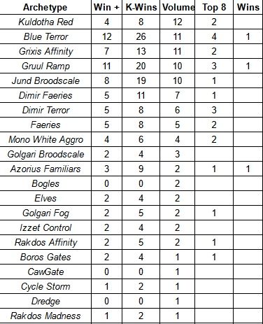 Leaning on this metric to make predictions for next week the decks I would expect to see tick up in success include Dimir Terror and Mono White Aggro. Of course using only one measure to try and understand the metagame only gives you part of the story. The addition of net wins less net losses (K-Score in my charts) provides yet another way to explore the format. For example, these two archetypes both had a negative aMSAR, meaning they performed worse than an average Top 32 deck. Put another way, I’m putting down my prognosticator hat for a week.