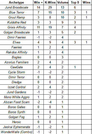 In the grand scheme of things – that is when I write my season recap – this one tournament will not have as large an impact on the information. But here it can have an outsized effect. The records serve to drag the worse decks down and make the strategies at the top of the standings seem slightly better than they may have been in actuality. Please keep that in mind when we examine the results.